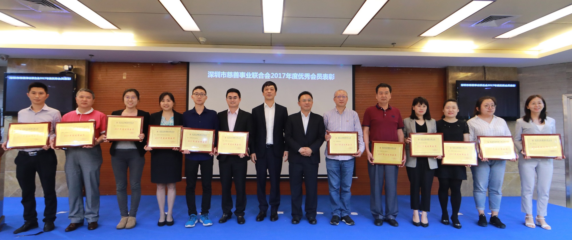 廖远飞局长、陈文清副局长和张思民会长向深圳市慈善会等10家会员单位和胡绵鹏等2位个人会员授予“2017年度深慈联优秀会员”荣誉牌匾,向在深慈联创办与成立初期做出突出贡献的刘炜等兼职副秘书长、饶锦兴顾问、郭云霞副秘书长授予“特殊贡献奖”。