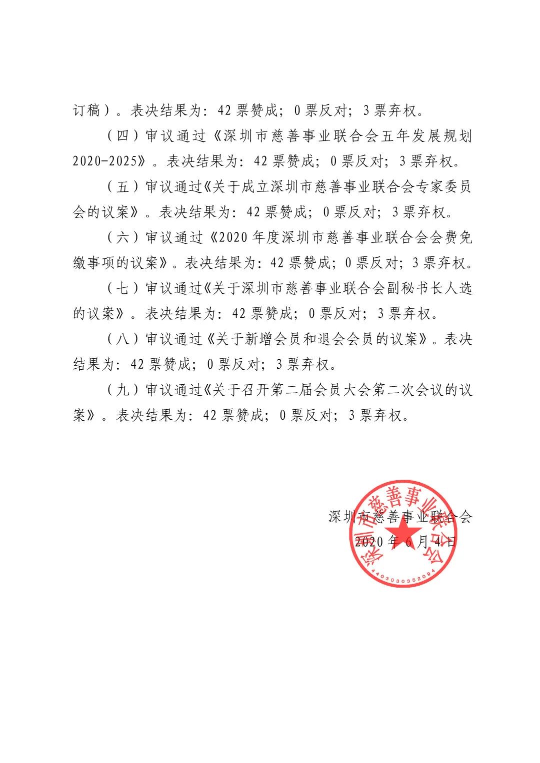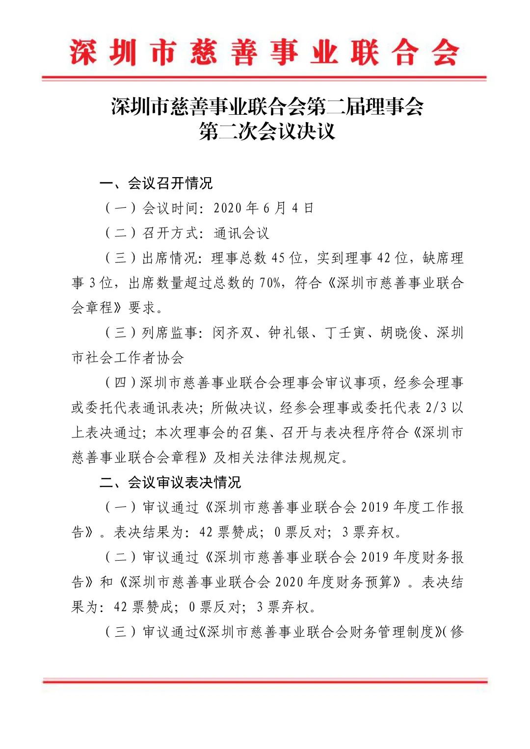 2020年6月4日,深圳市慈善事业联合会第二届理事会第二次会议以通讯方式召开。本次理事会审议通过了以下议案: